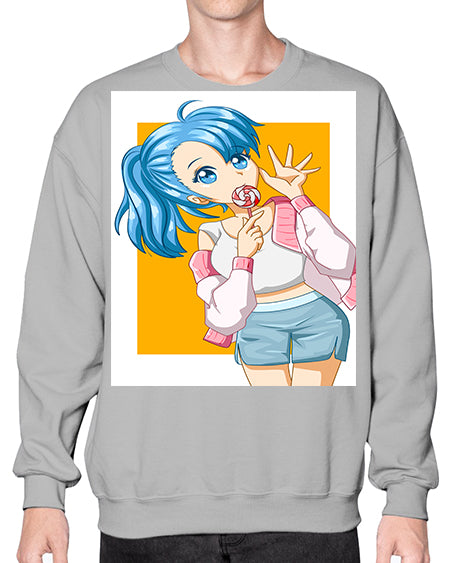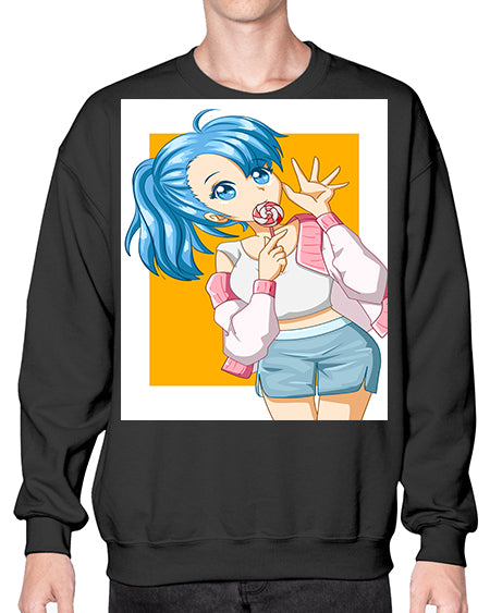 Cute and happy girl blue hair eating the lollipop 112# - anime- Sweatshirt - Crew