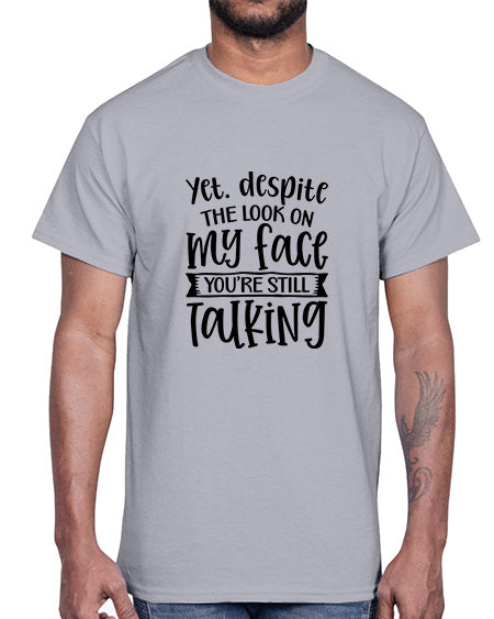 Yet despite the look on my face youre still talking 1263#- funny- Cotton Tee