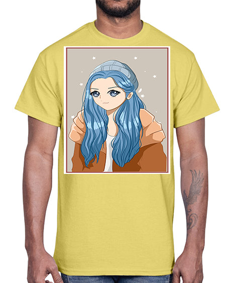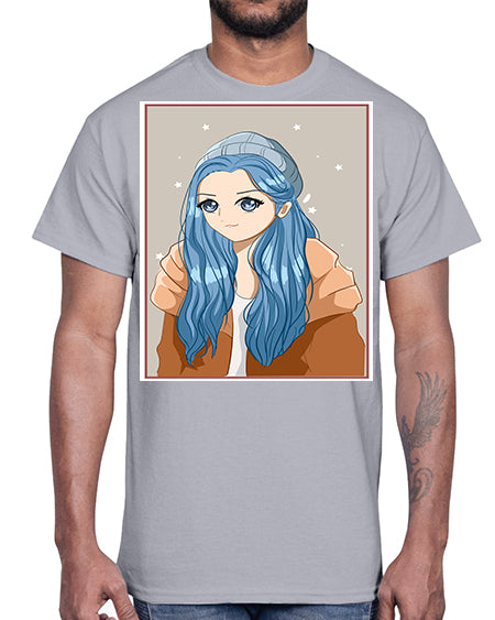 Cute and beautiful girl long blue hair in the winter 142#- anime- Cotton Tee