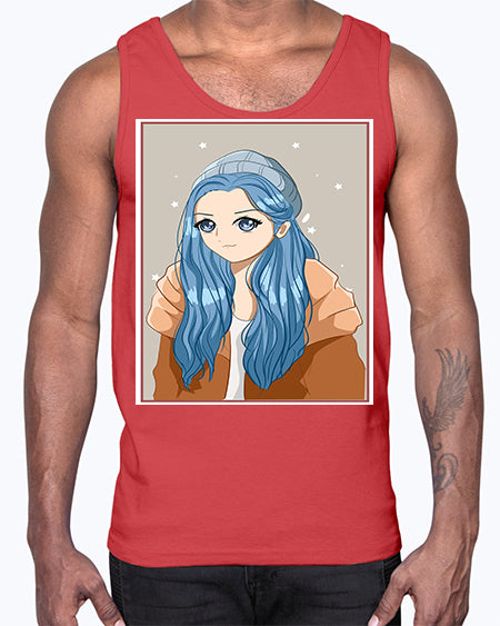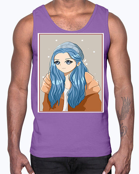 Cute and beautiful girl long blue hair in the winter 142#- anime- Cotton Tank