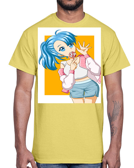Cute and happy girl blue hair eating the lollipop 112#- anime- Cotton Tee