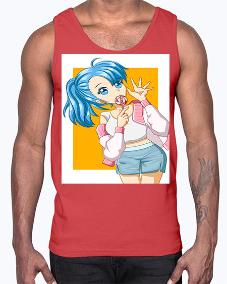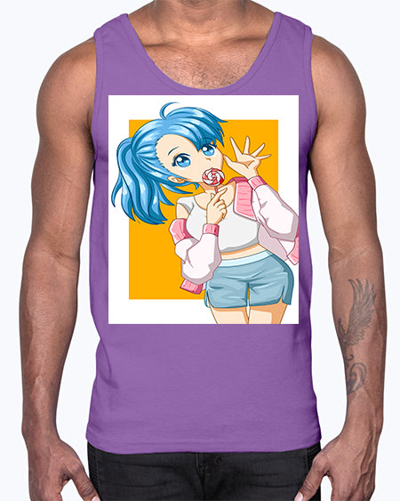 Cute and happy girl blue hair eating the lollipop 112#- anime- Cotton Tank