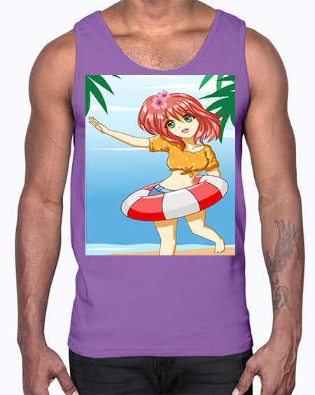 Cute and happy girl in beach with buoy in the summer 184#- anime- Cotton Tank