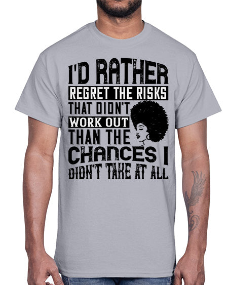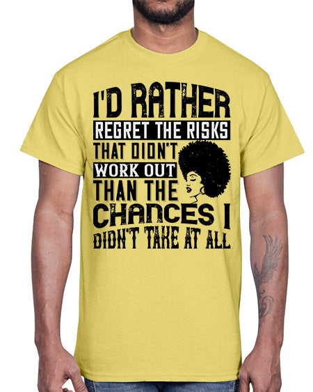 Id rather regret the risks that didnt work out than the chances I didnt take at all Style 23#- black afro- Cotton Tee