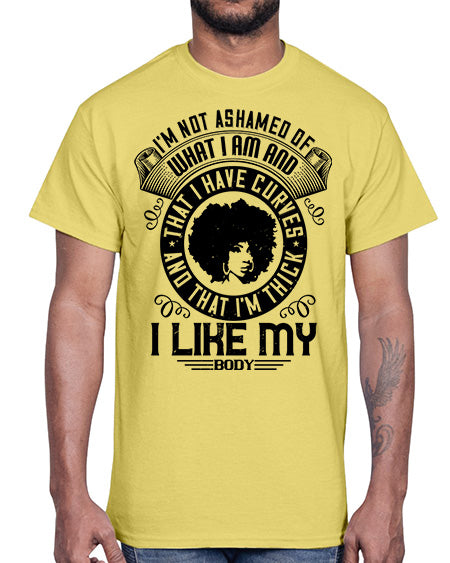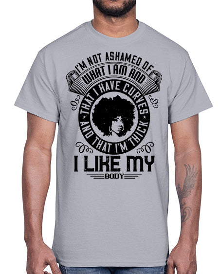 Im not ashamed of what I am and that I have curves and that Im thick I like my body Style 22#- black afro- Cotton Tee