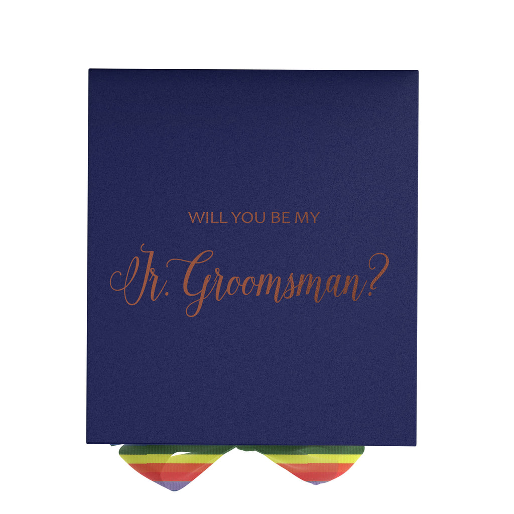 Will you be my jr groomsman, gift box only, metallic writing on lid of box, Navy box, with Rainbow Bow. - No Border