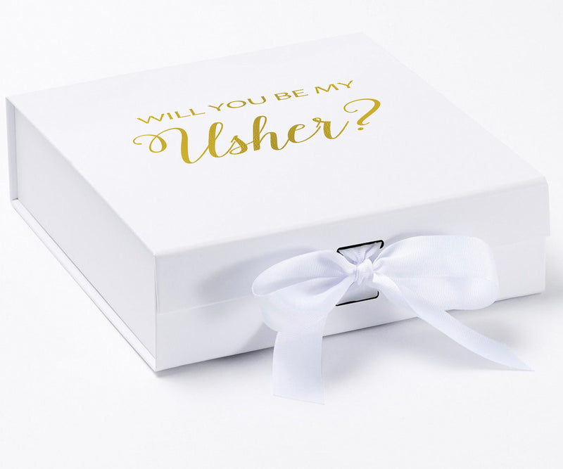 Will you be my Usher, gift box only, metallic writing on lid of box, Navy box, with Rainbow Bow. - No Border