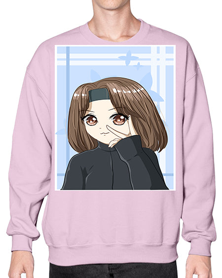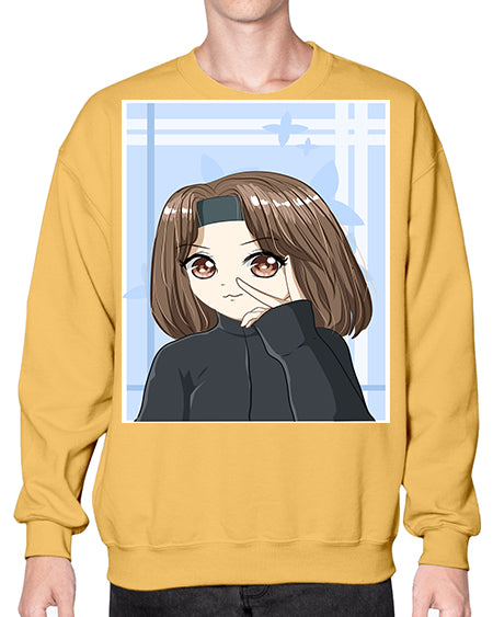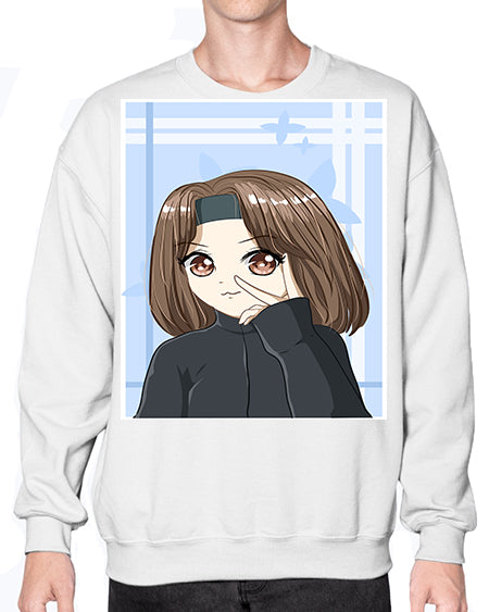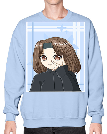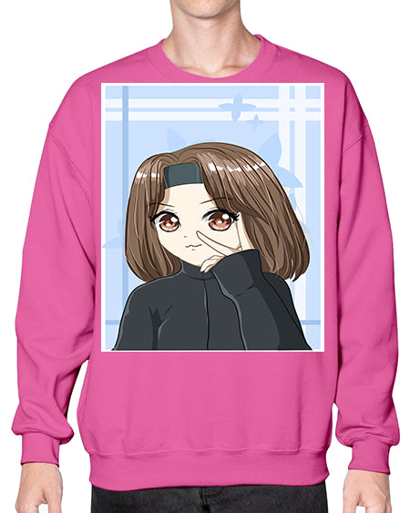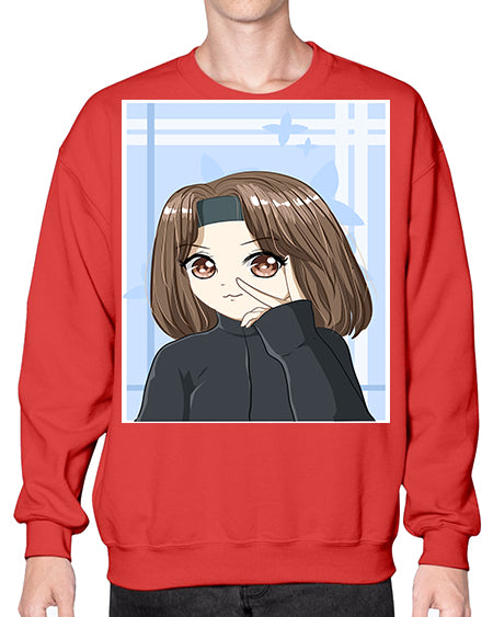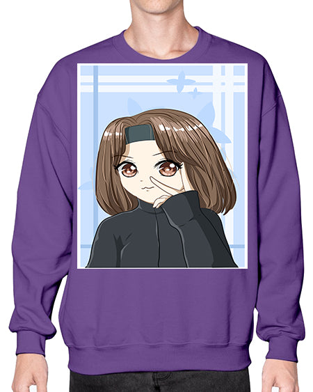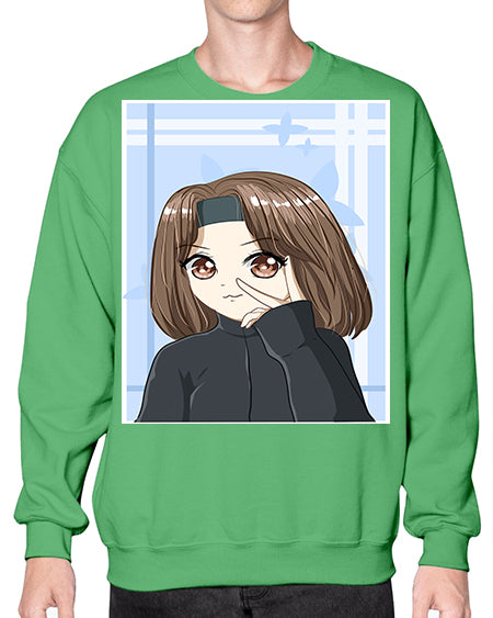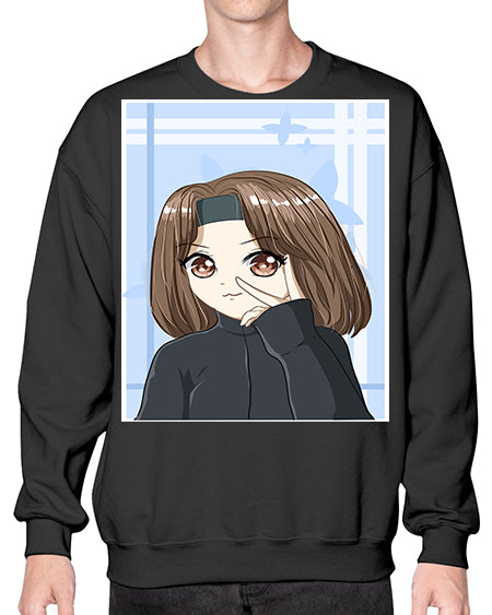 Beautiful and happy girl brown short hair with black jacket 89# - anime- Sweatshirt - Crew