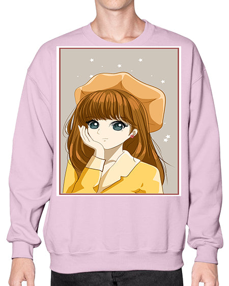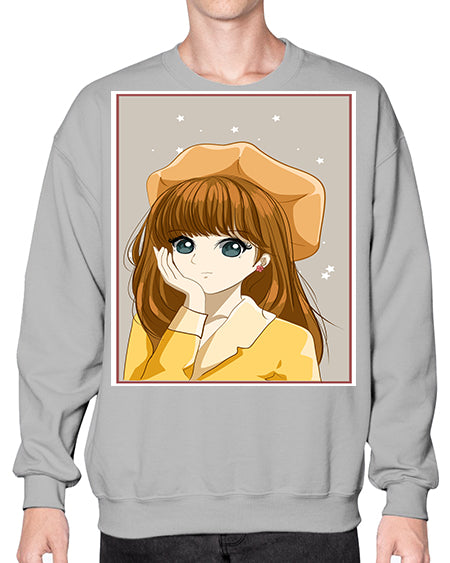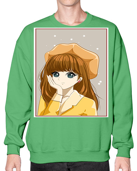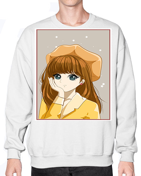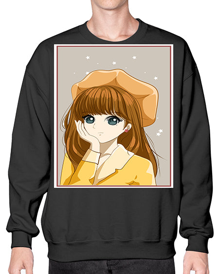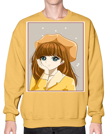 Beautiful and pretty girl brown long hair with yellow hat 128# - anime- Sweatshirt - Crew