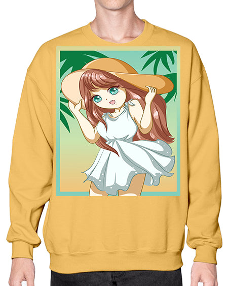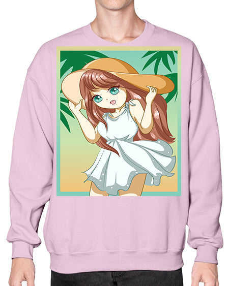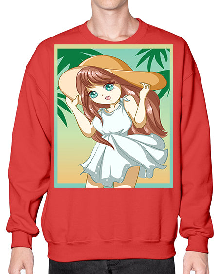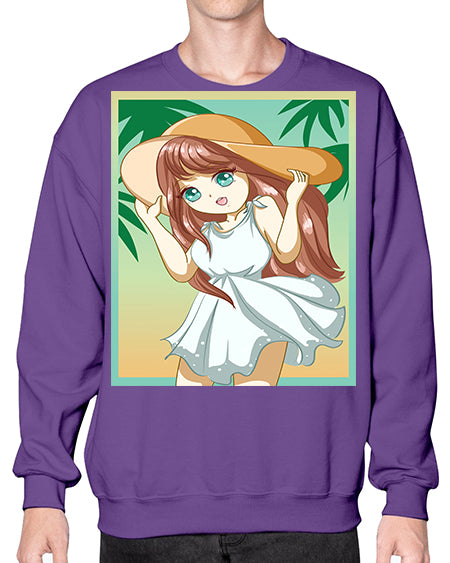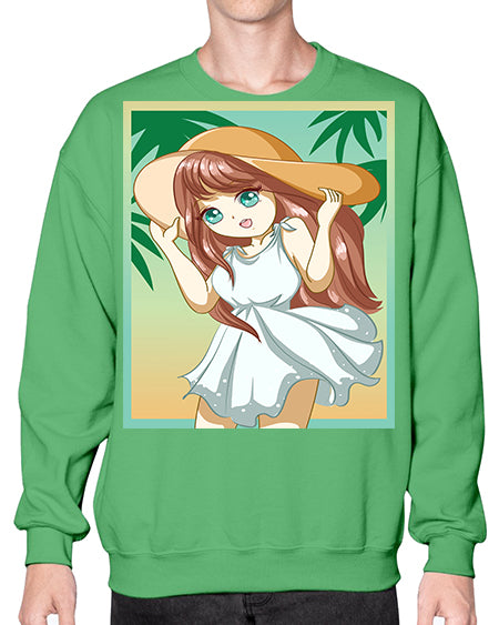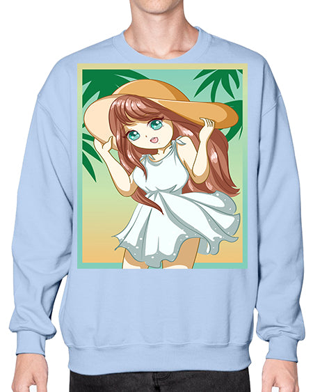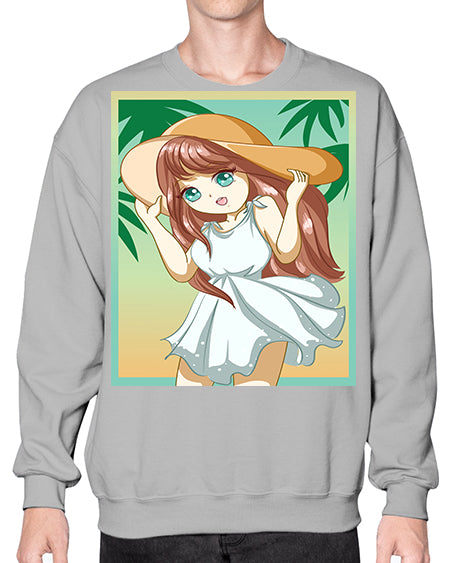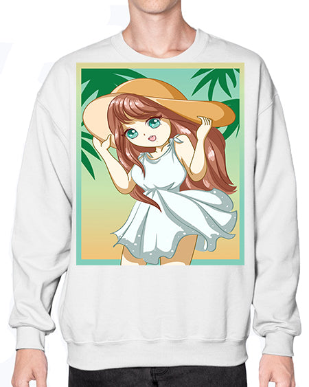 Cute and beautiful girl with white dress in beach at summer 162# - anime- Sweatshirt - Crew
