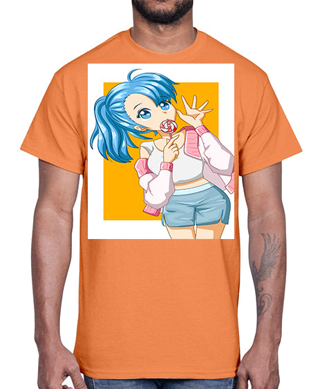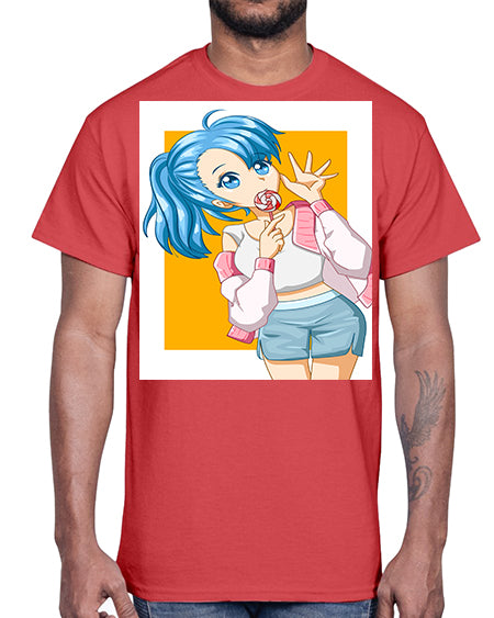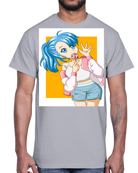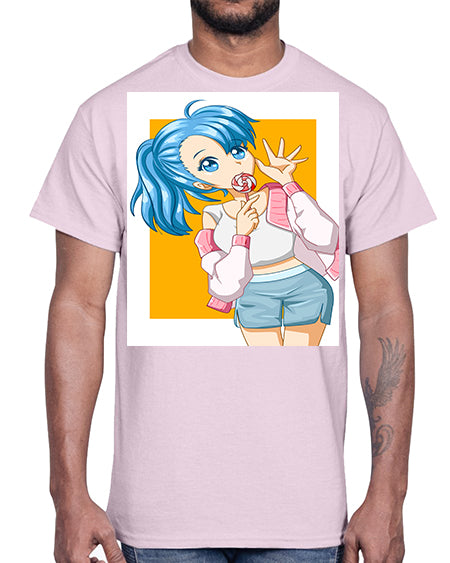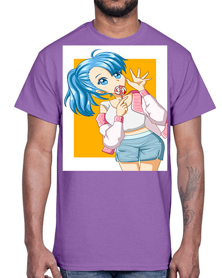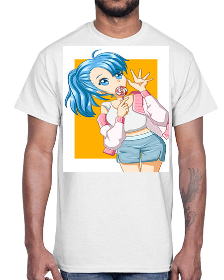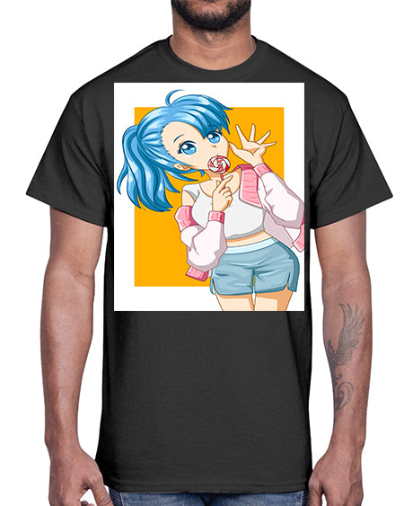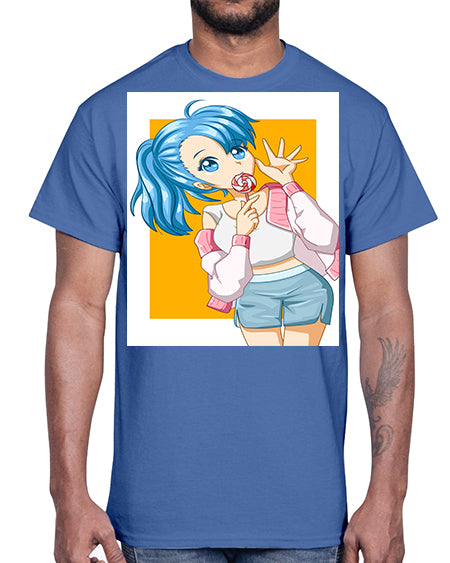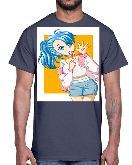 Cute and happy girl blue hair eating the lollipop 112#- anime- Cotton Tee