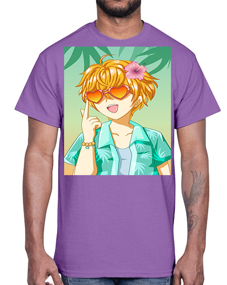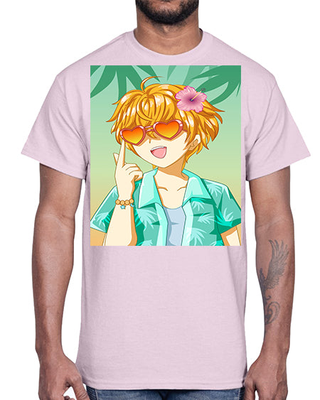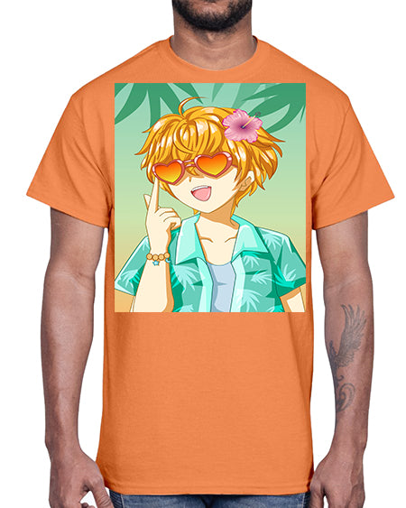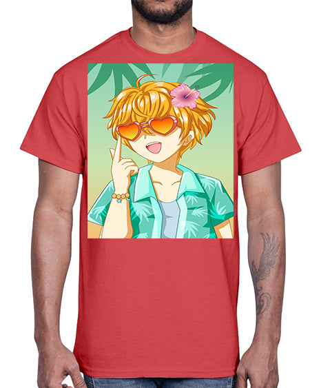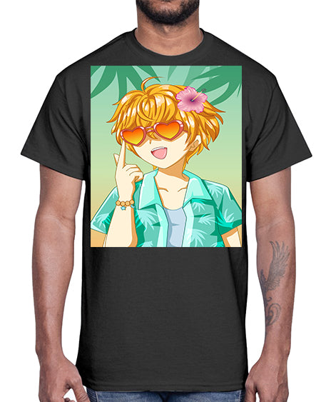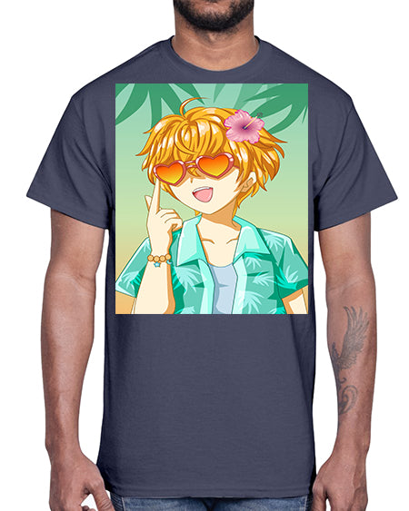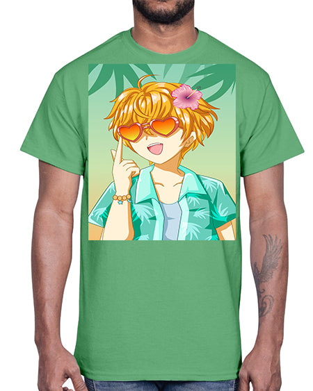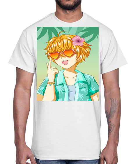 Happy and cute boy with glasses in beach in the summer 180#- anime- Cotton Tee