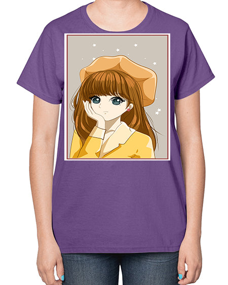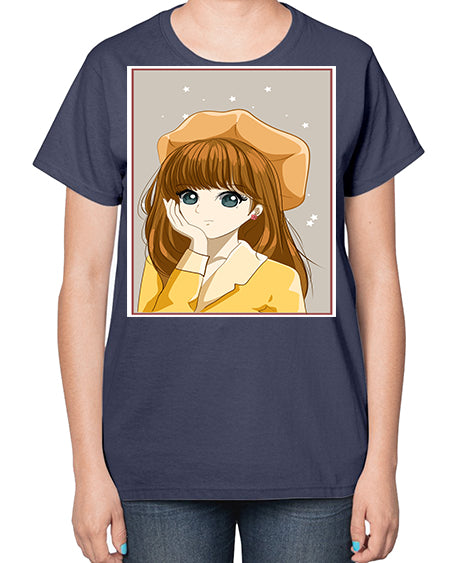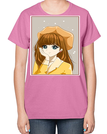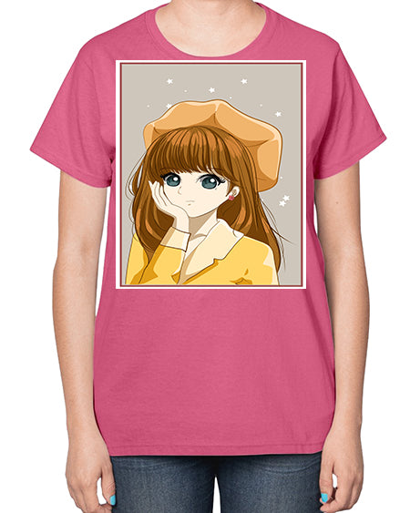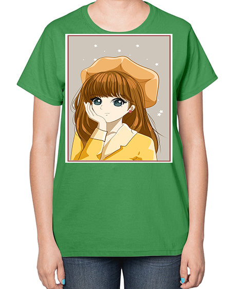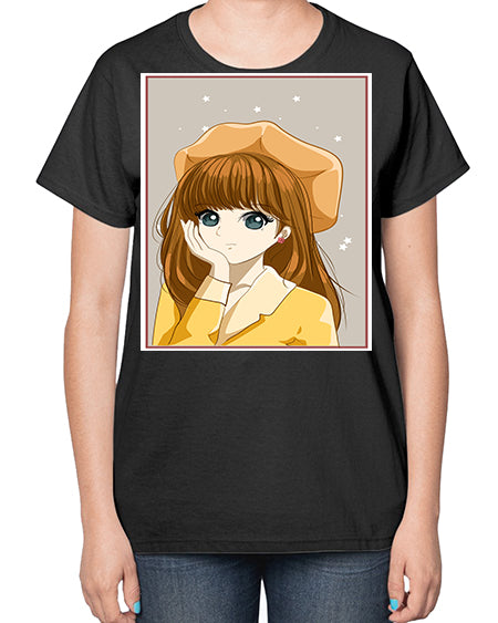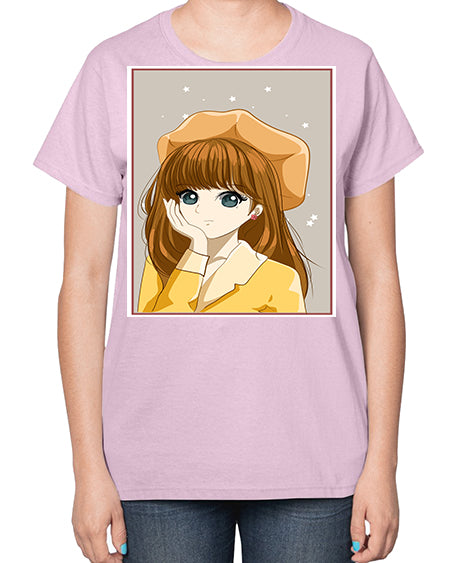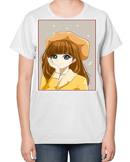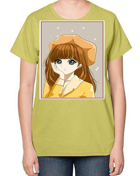 Beautiful and pretty girl brown long hair with yellow hat 128# - anime- Ladies T-Shirt