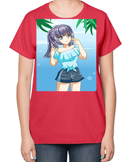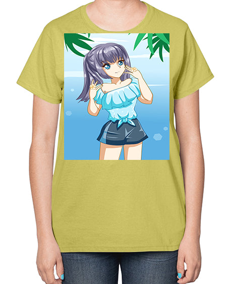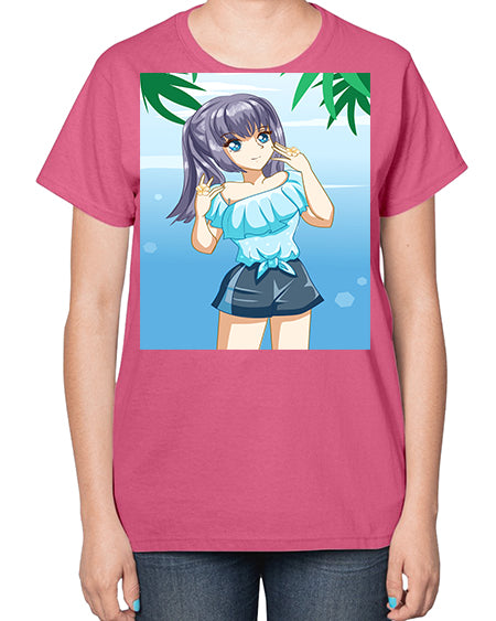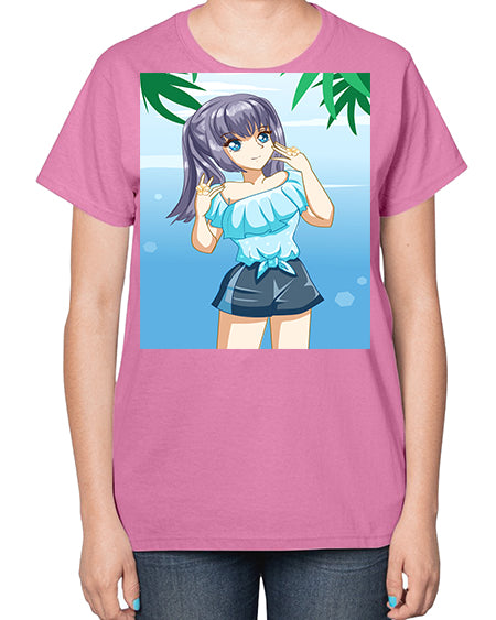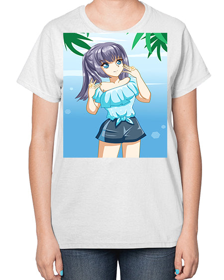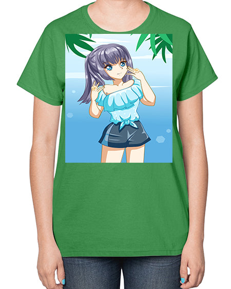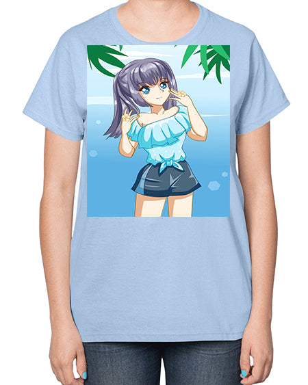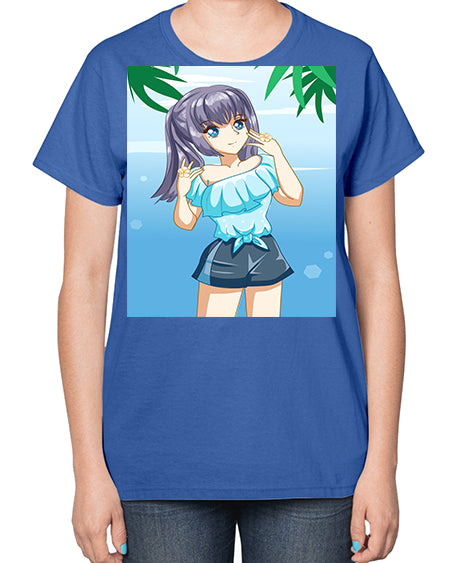 google-site-verification=jVrHOkW2AsgL_ozwUikqFQE6-Ke6U43Z8aLcUbXT5TE Cute and happy girl with blue shirt in summer 125# - anime- Ladies T-S – Tshirt Unlimited