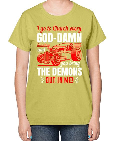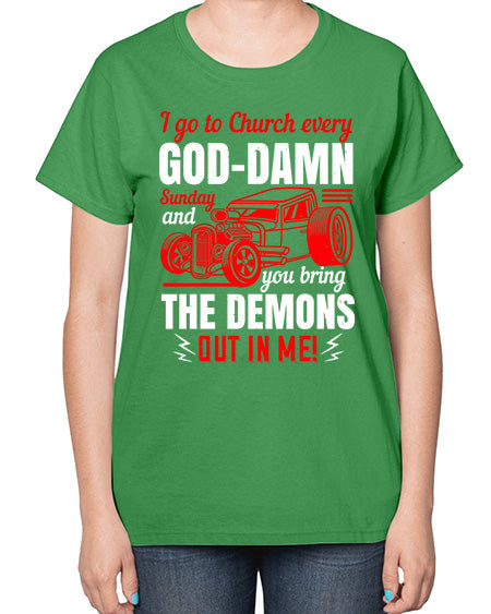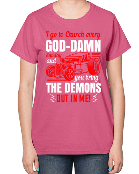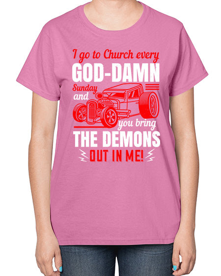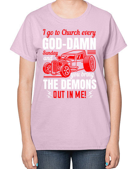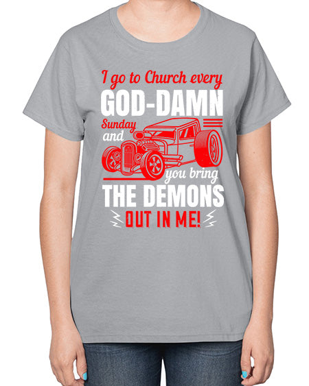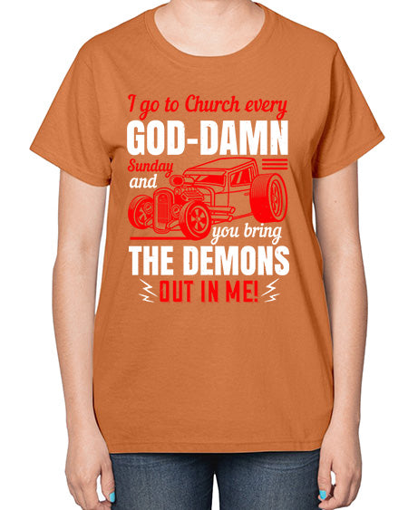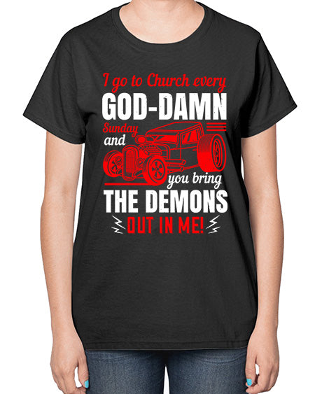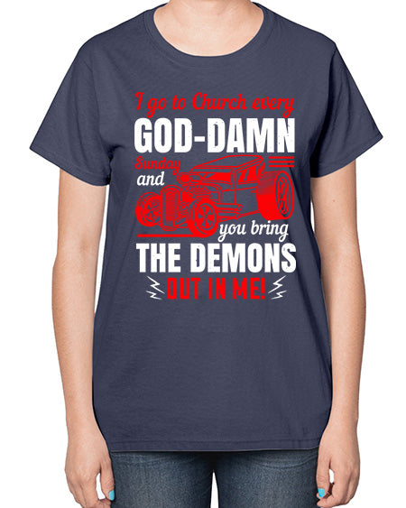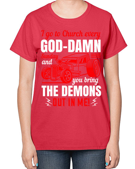 I go to Church every GodDamn Sunday and you bring the demons out in me 102# - hot rod- Ladies T-Shirt