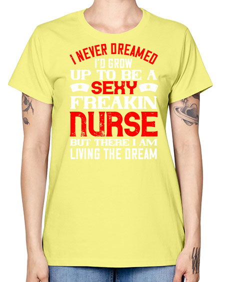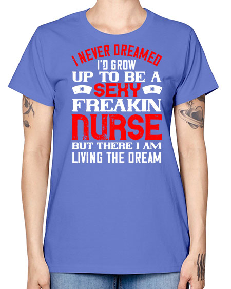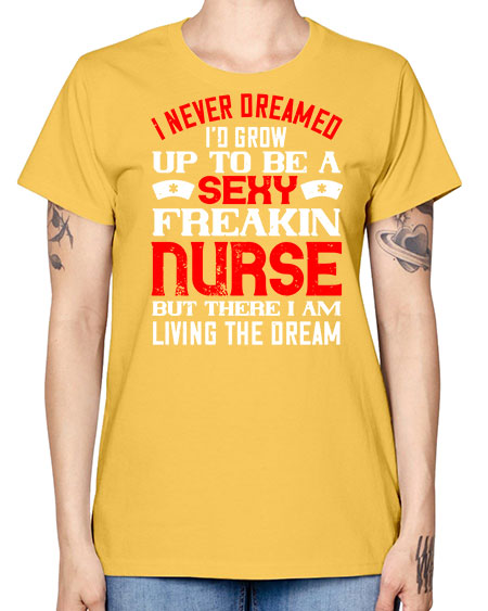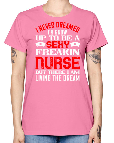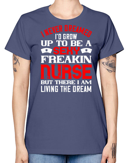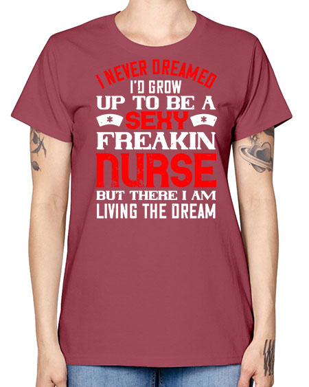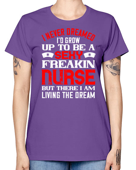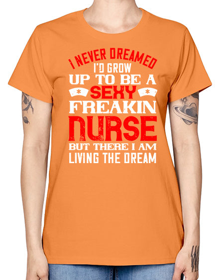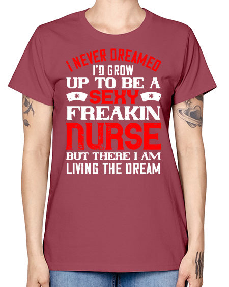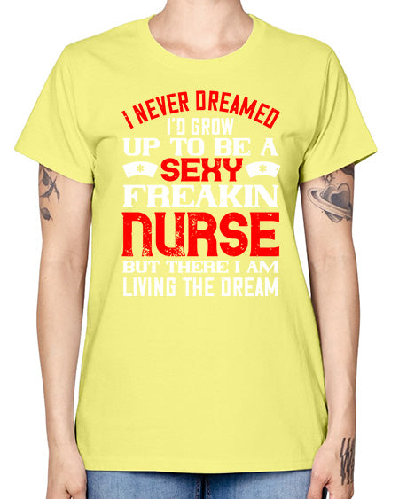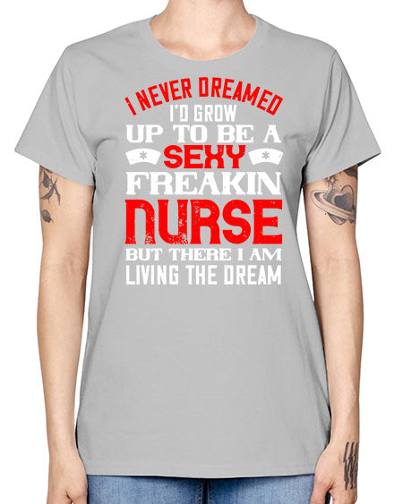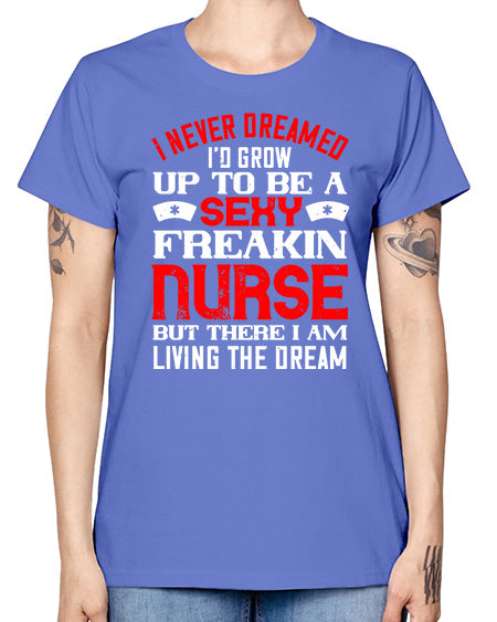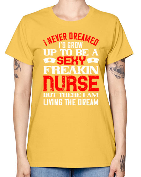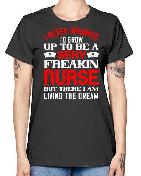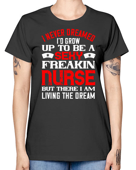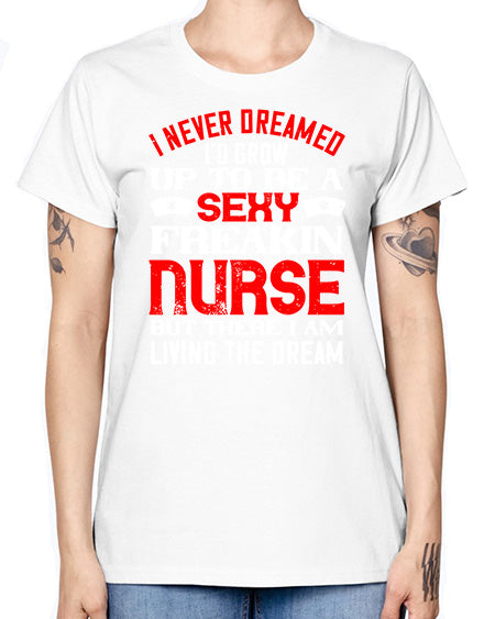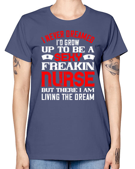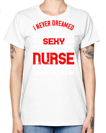 I never dreamed id grow up to be a sexy freakin nurse but there i am living the dream Style 913# - nurse- Missy T-Shirt - 100% preshrunk cotton