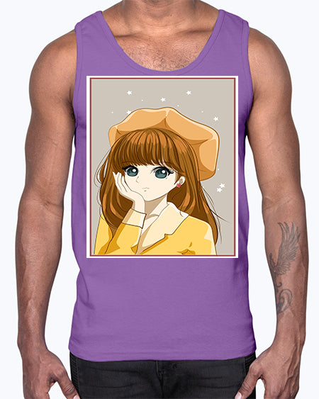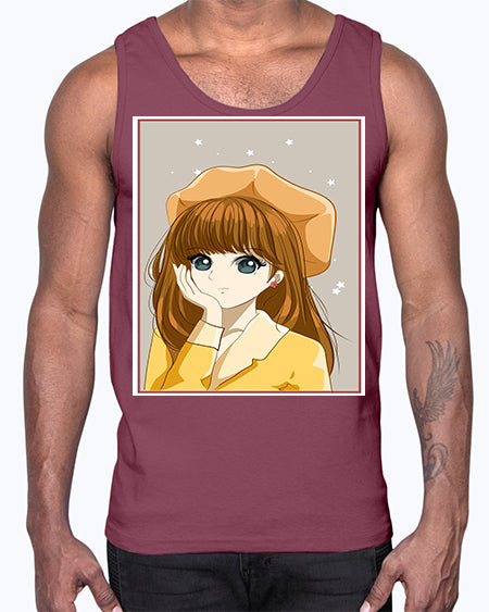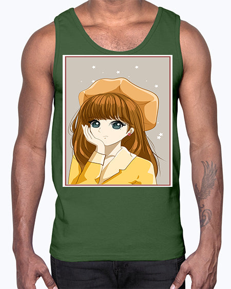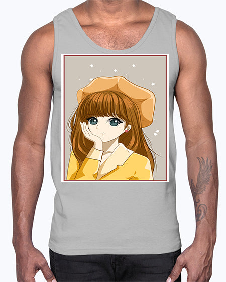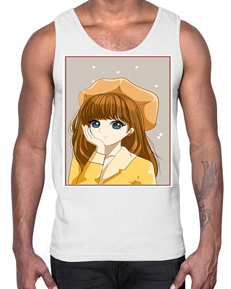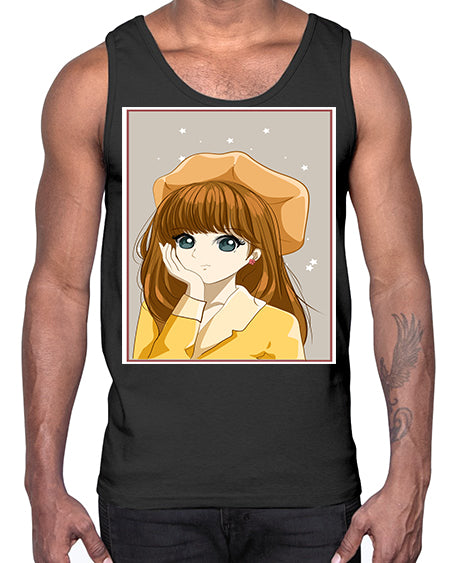 Beautiful and pretty girl brown long hair with yellow hat 128#- anime- Cotton Tank