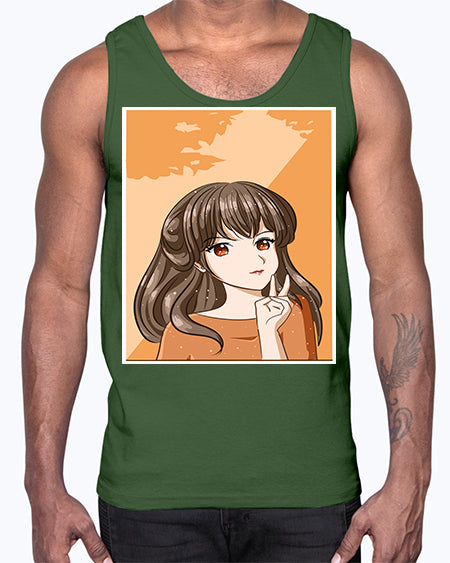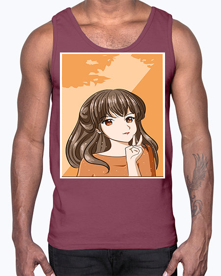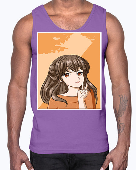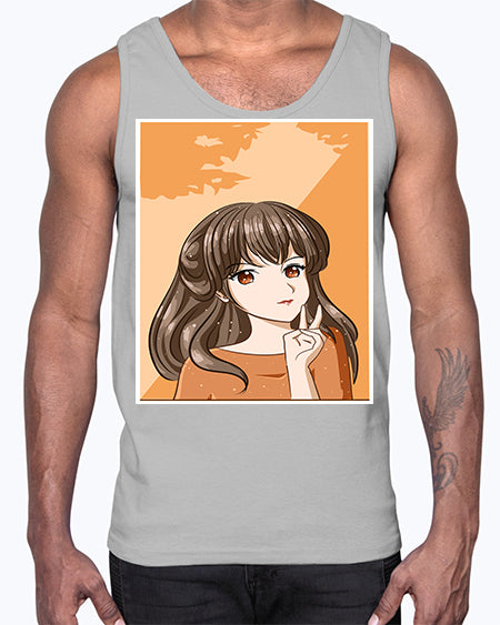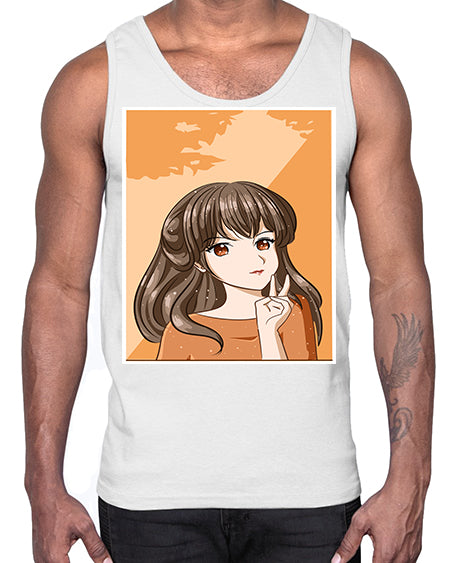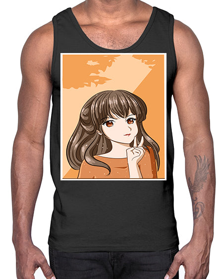 Beautiful and pretty girl long hair with orange background 100#- anime- Cotton Tank