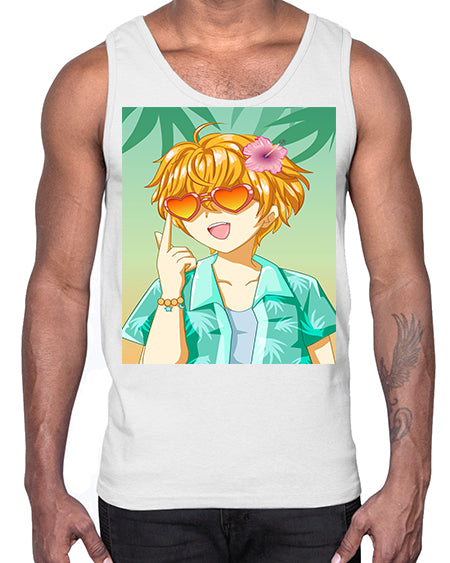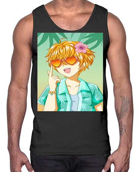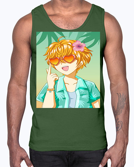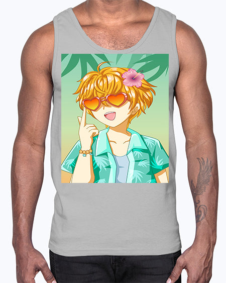 Happy and cute boy with glasses in beach in the summer 180#- anime- Cotton Tank