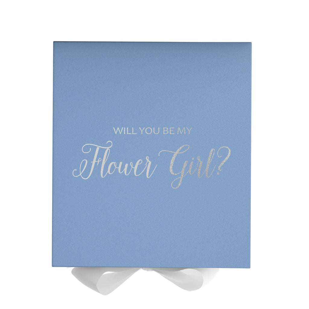 Will you be my Flower Girl, gift box only, metallic writing on lid of box, Light Blue box, with Light Blue w/ White Bow. - No Border