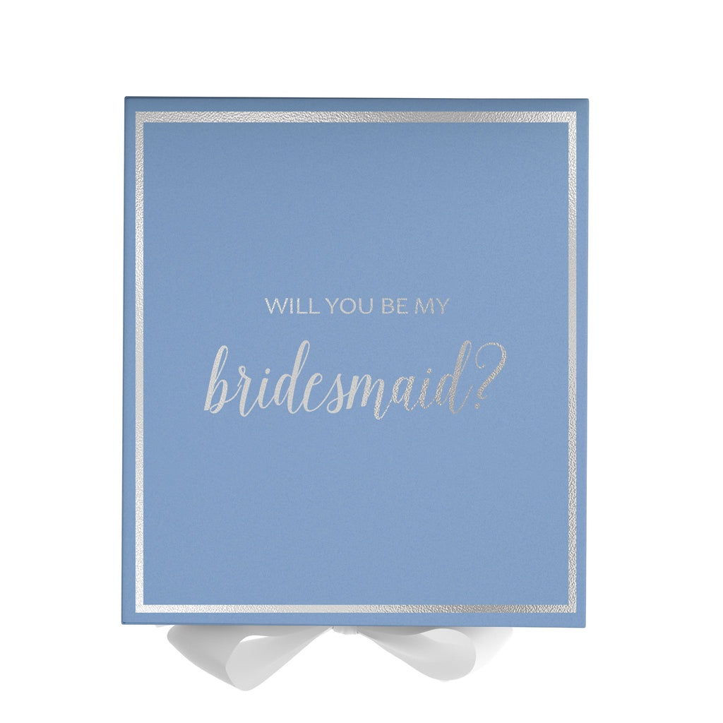 Will you be my bridesmaid, gift box only, metallic writing on lid of box, Light Blue box, with Light Blue w/ White Bow. - Border