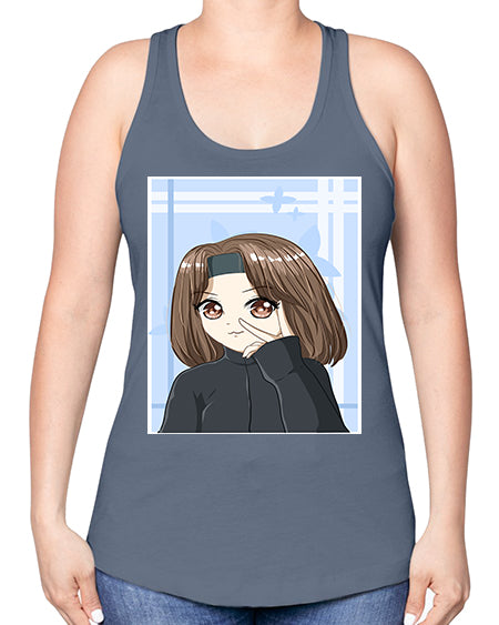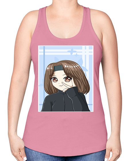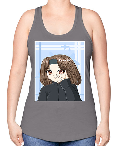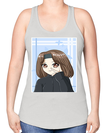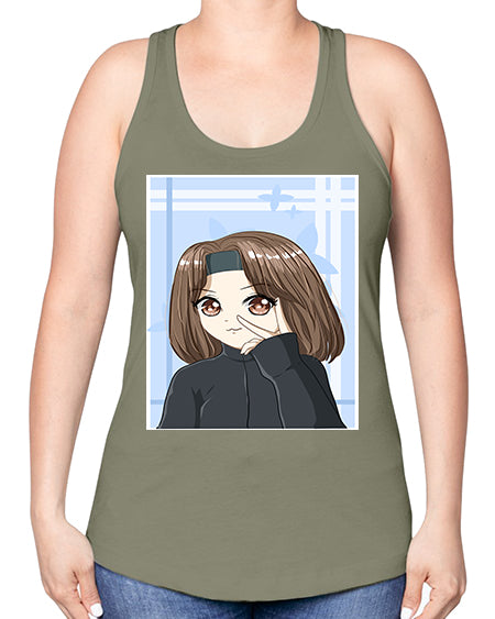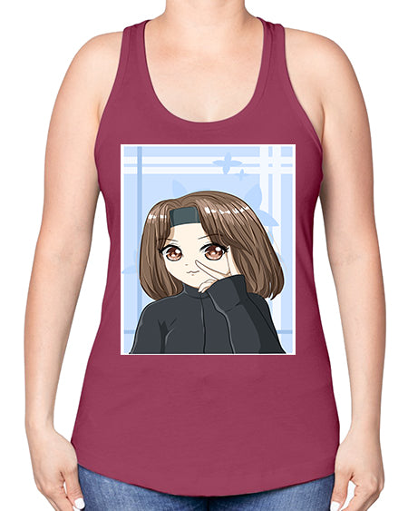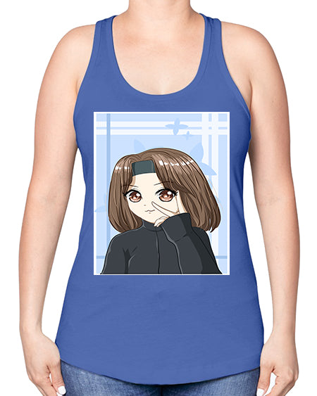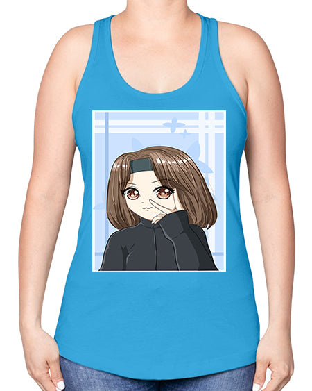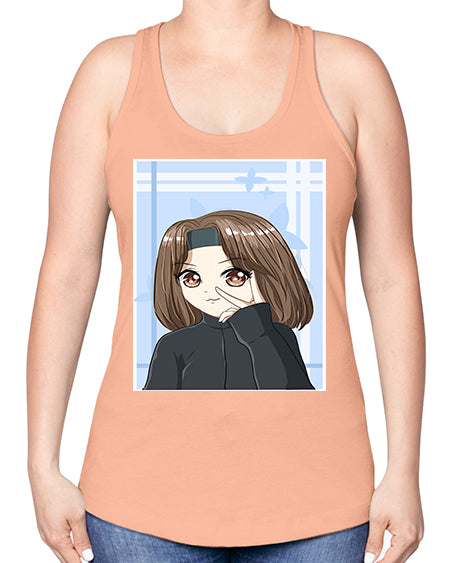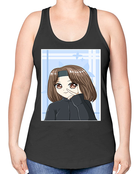 Beautiful and happy girl brown short hair with black jacket 89# - anime -Racerback Tank