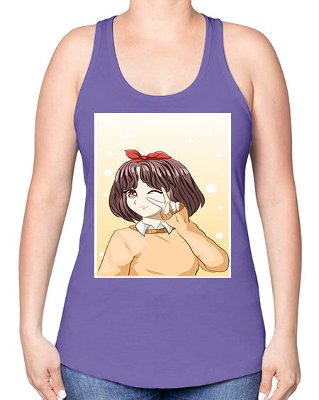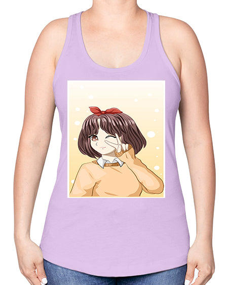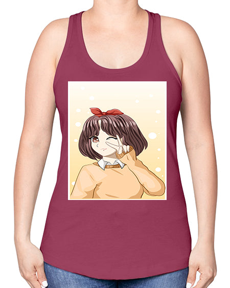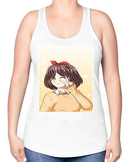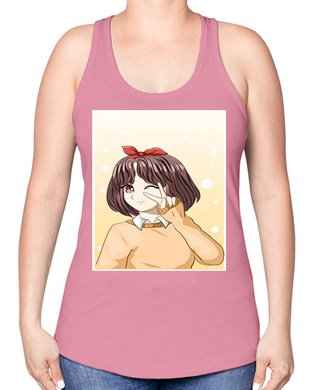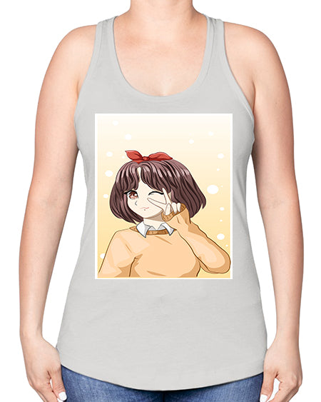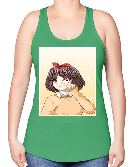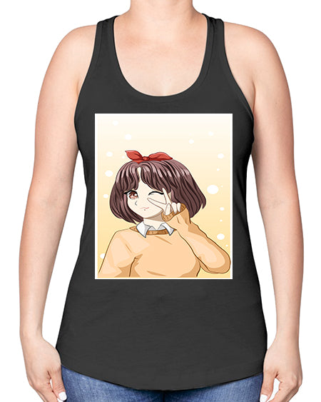 Beautiful and happy girl brown short hair with cheers hand 86# - anime -Racerback Tank