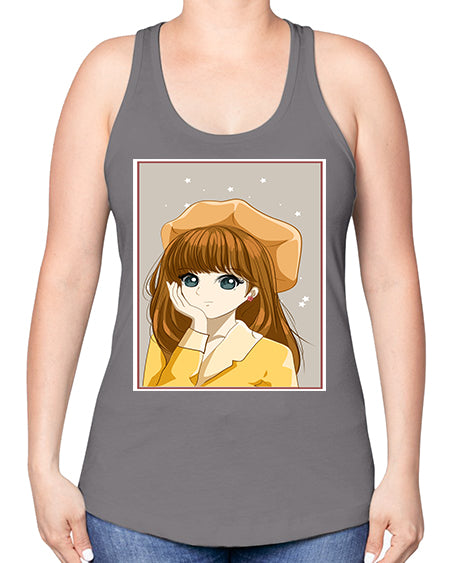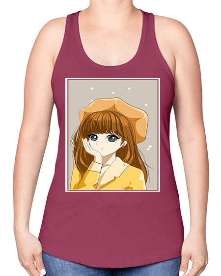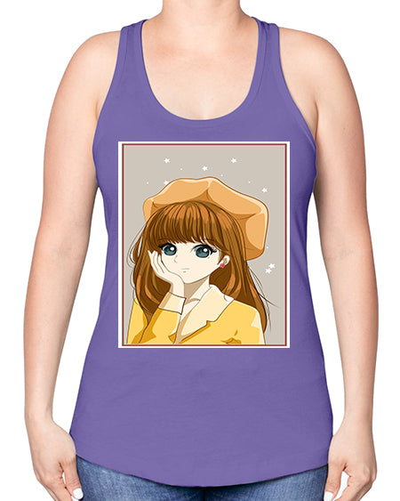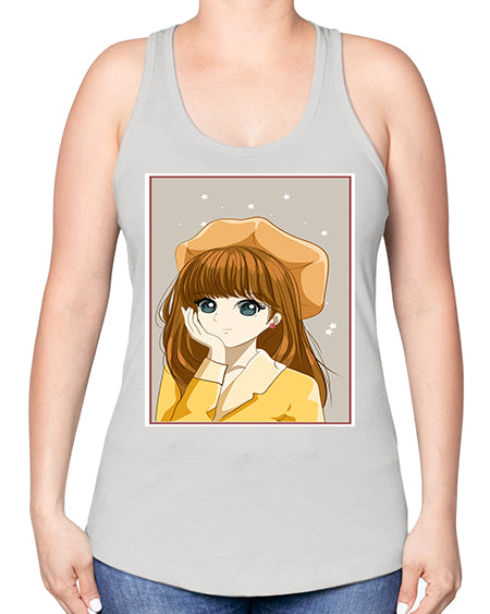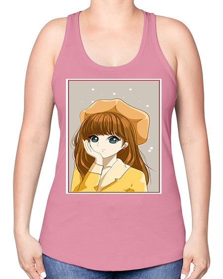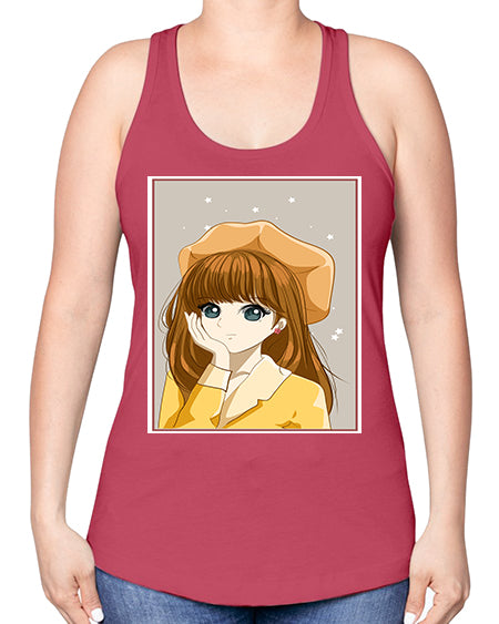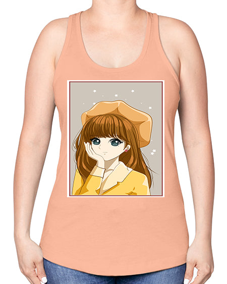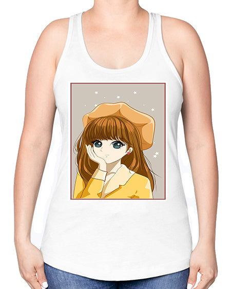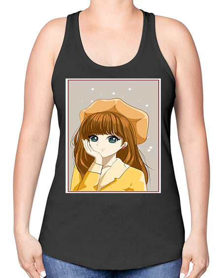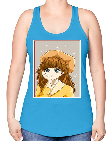 Beautiful and pretty girl brown long hair with yellow hat 128# - anime -Racerback Tank