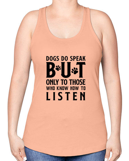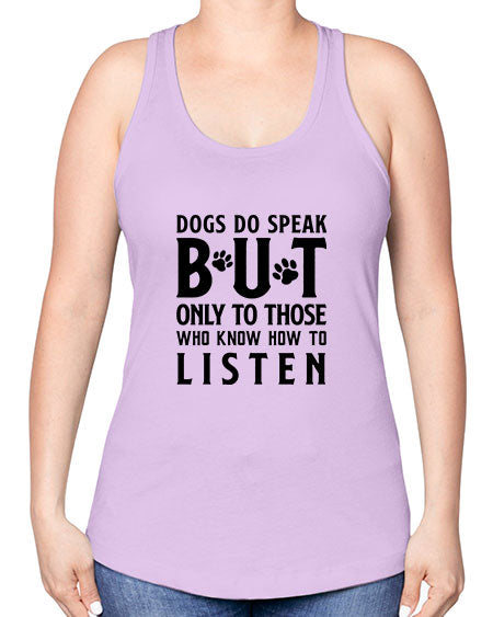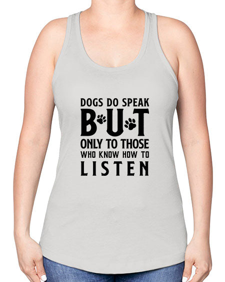 dogs do speak but only to those who know how to listen 131#- dogs -Racerback Tank Note: There is a 2 - 4 day creation time, which may delay shipping. Features: - 60% combed ringspun cotton/40% polyester lightweight jersey