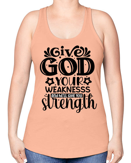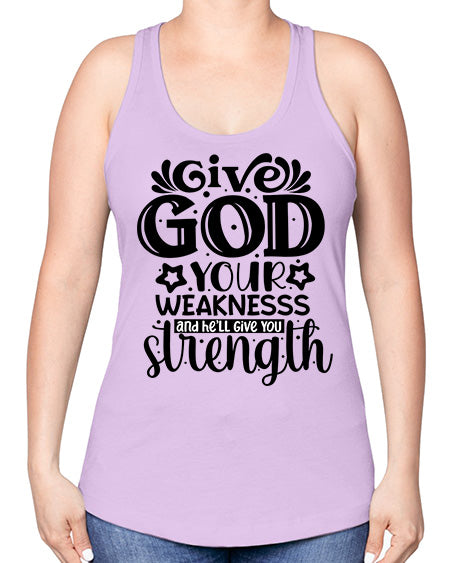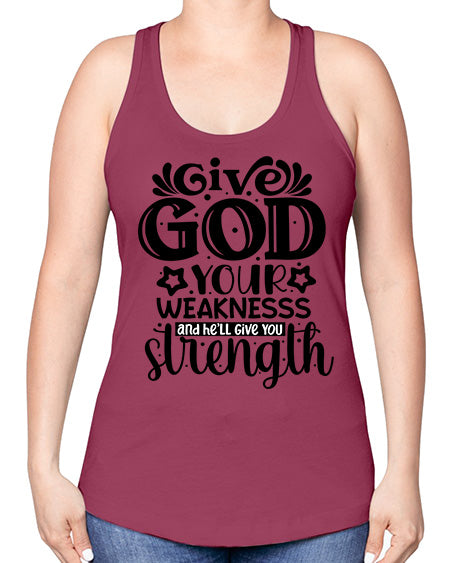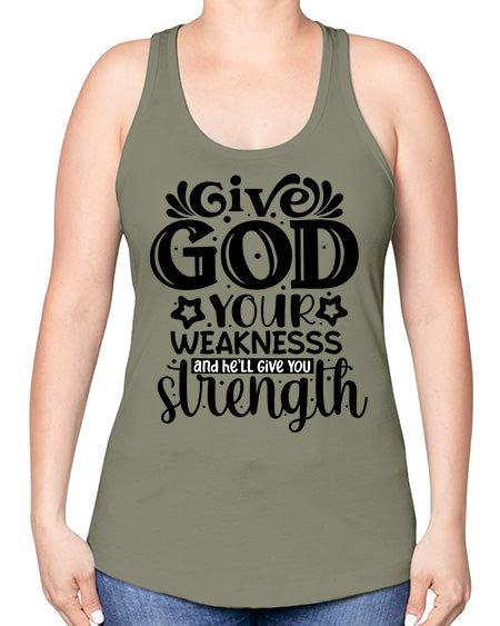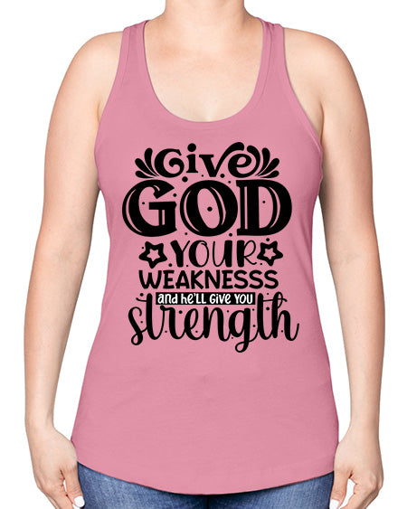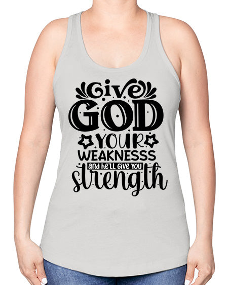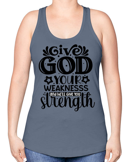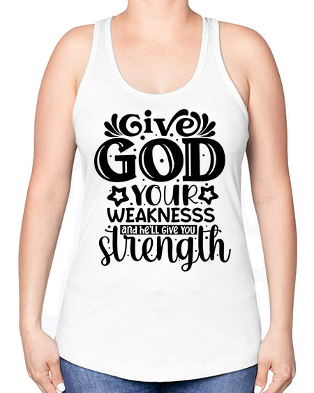 Give god your weaknesss and hell give you strength Style 37#- Sub -Racerback Tank Note: There is a 2 - 4 day creation time, which may delay shipping. Features: - 60% combed ringspun cotton/40% polyester lightweight jersey