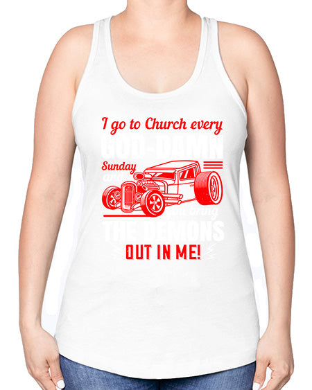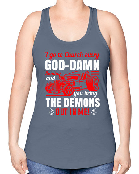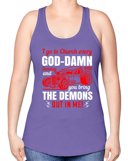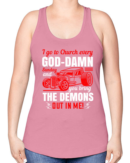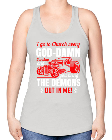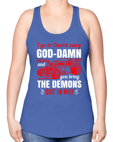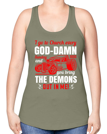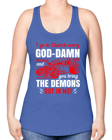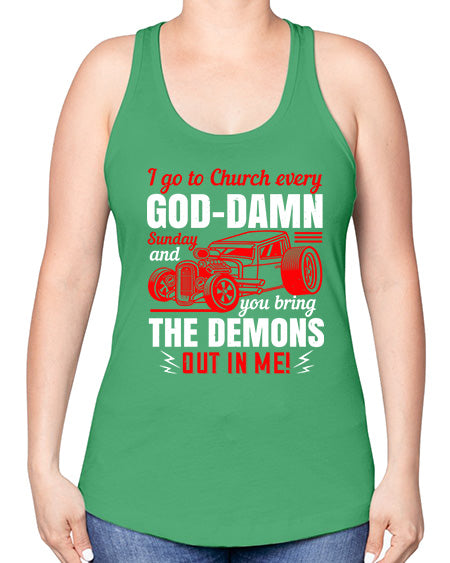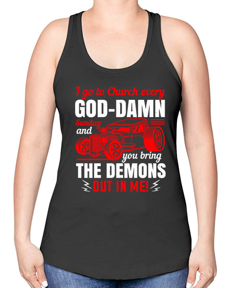 I go to Church every GodDamn Sunday and you bring the demons out in me 102#- hot rod -Racerback Tank