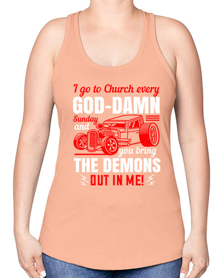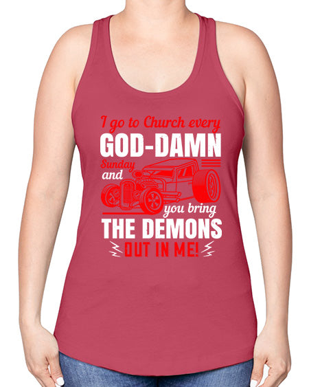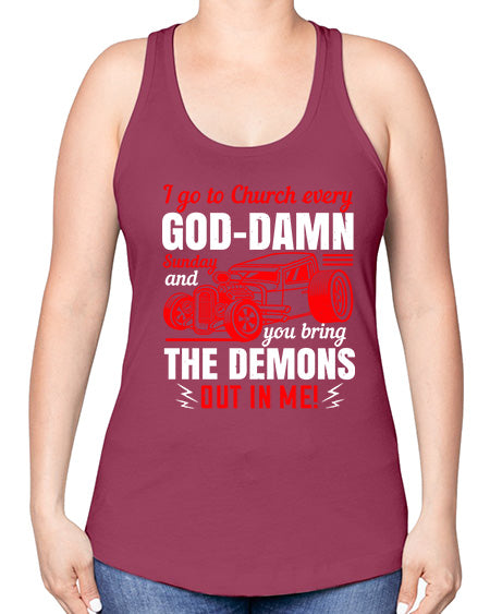 I go to Church every GodDamn Sunday and you bring the demons out in me 102# - hot rod -Racerback Tank