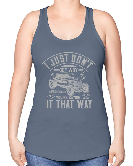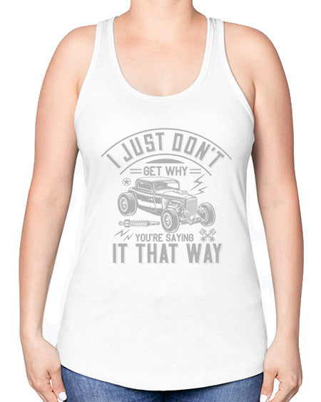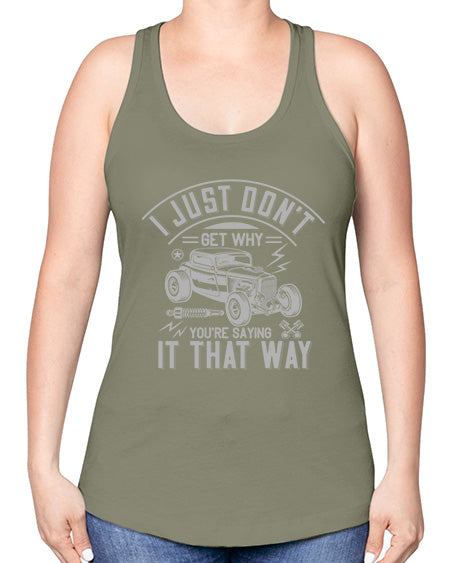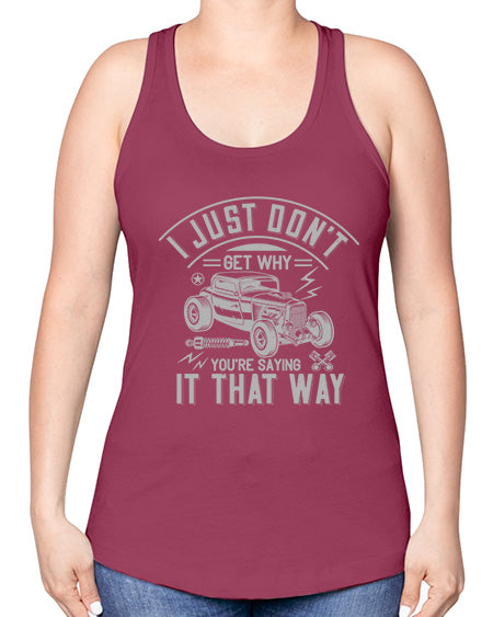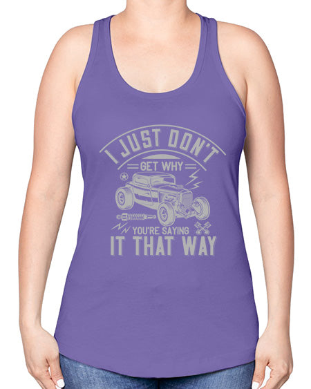 I just dont get why youre saying it that way 101# - hot rod -Racerback Tank
