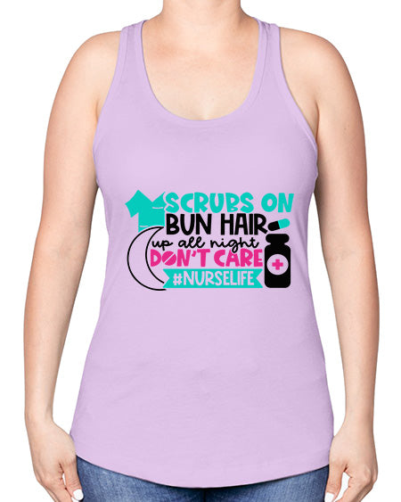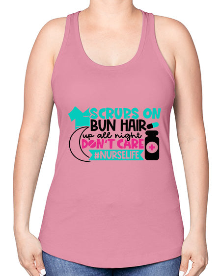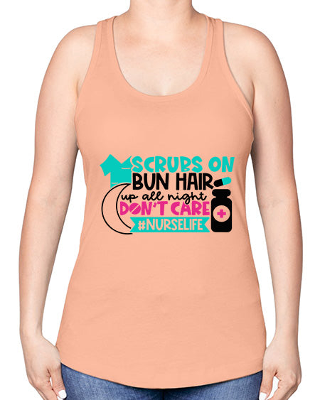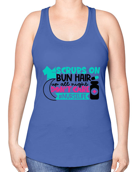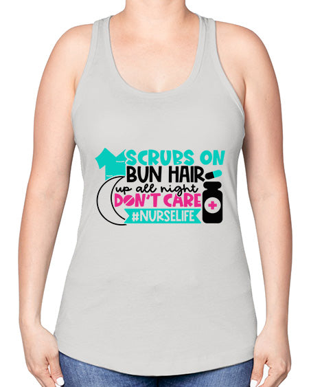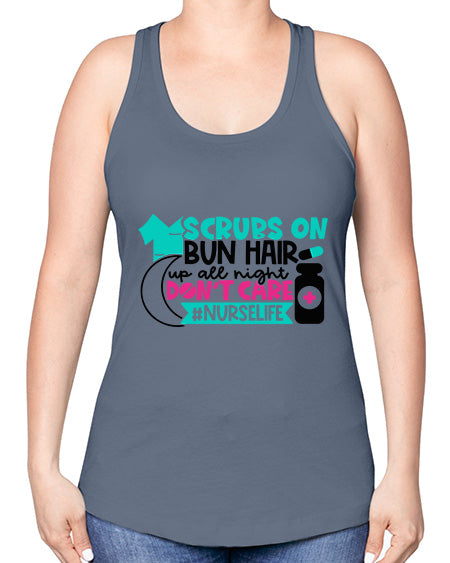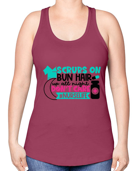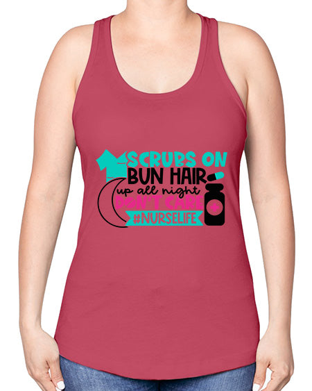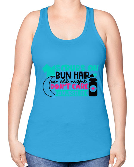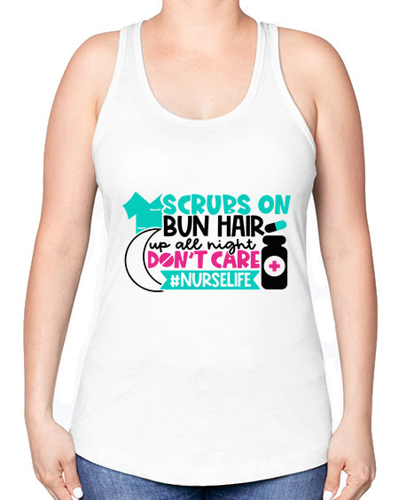 Scrubs On Bun Hair Up All Night Dont Care Nurselife Style Style 1385# - nurse -Racerback Tank