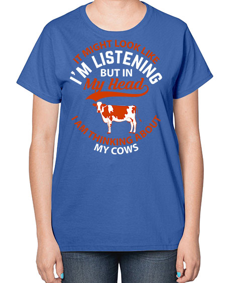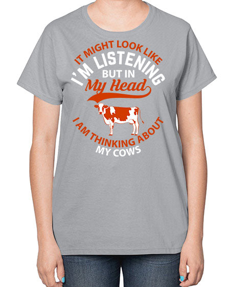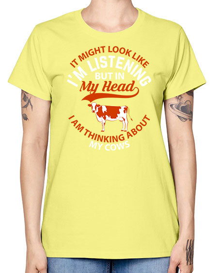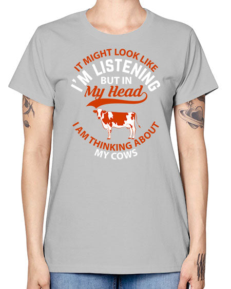 it might look like i’m listening but in my head i am thinking about my cows Style 2# - cow- Ladies T-Shirt