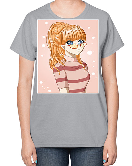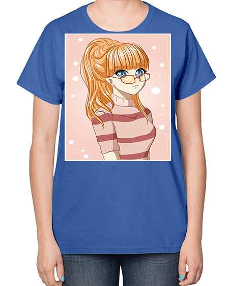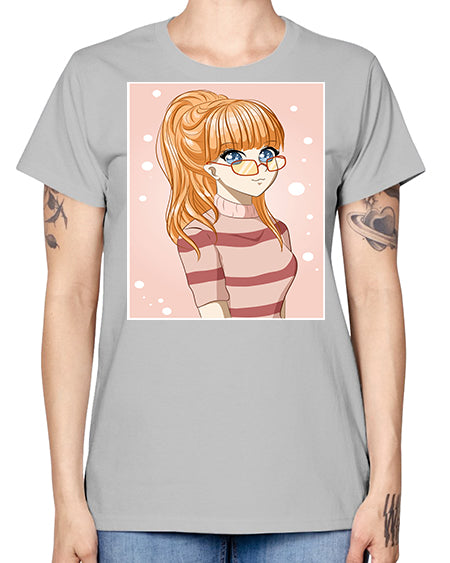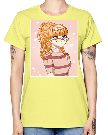 Beautiful and cool girl orange hair with glasses 105# - anime- Ladies T-Shirt