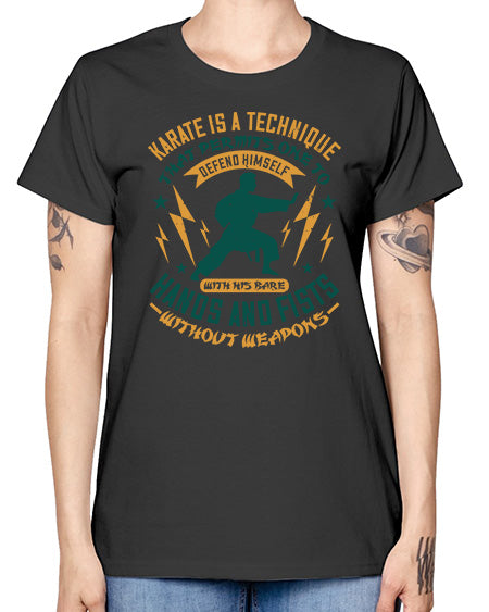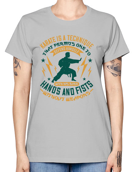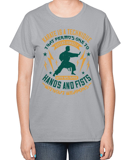 karate is a technique that permits one to defend himself with his bare hands and fists without weapons 389# - karate MMA- Ladies T-Shirt
