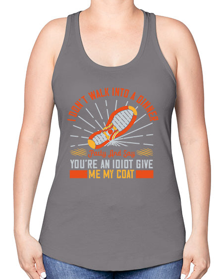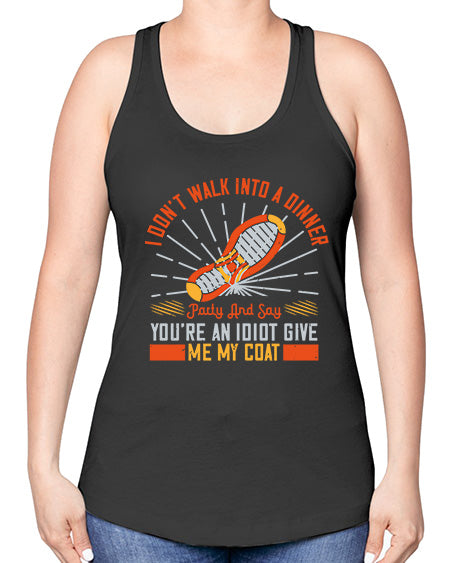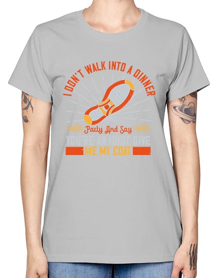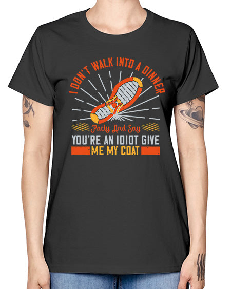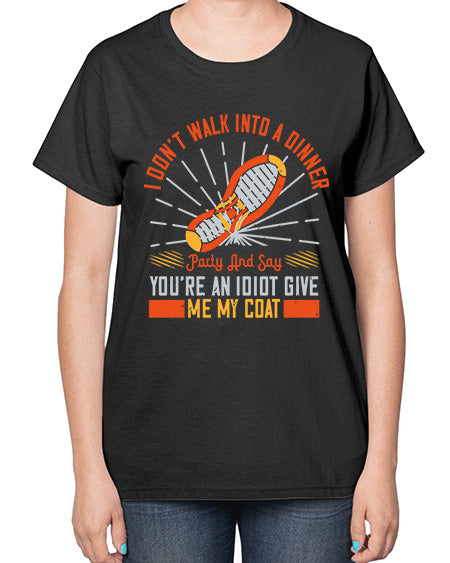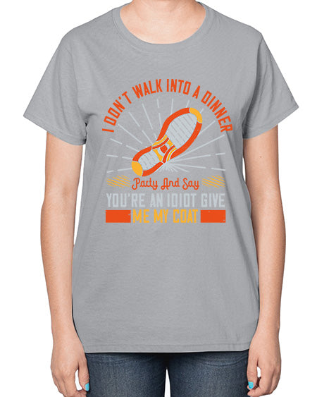 i dont walk into a dinner party and say youre an idiot give me my coat 285# - walking- Ladies T-Shirt