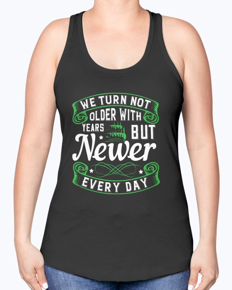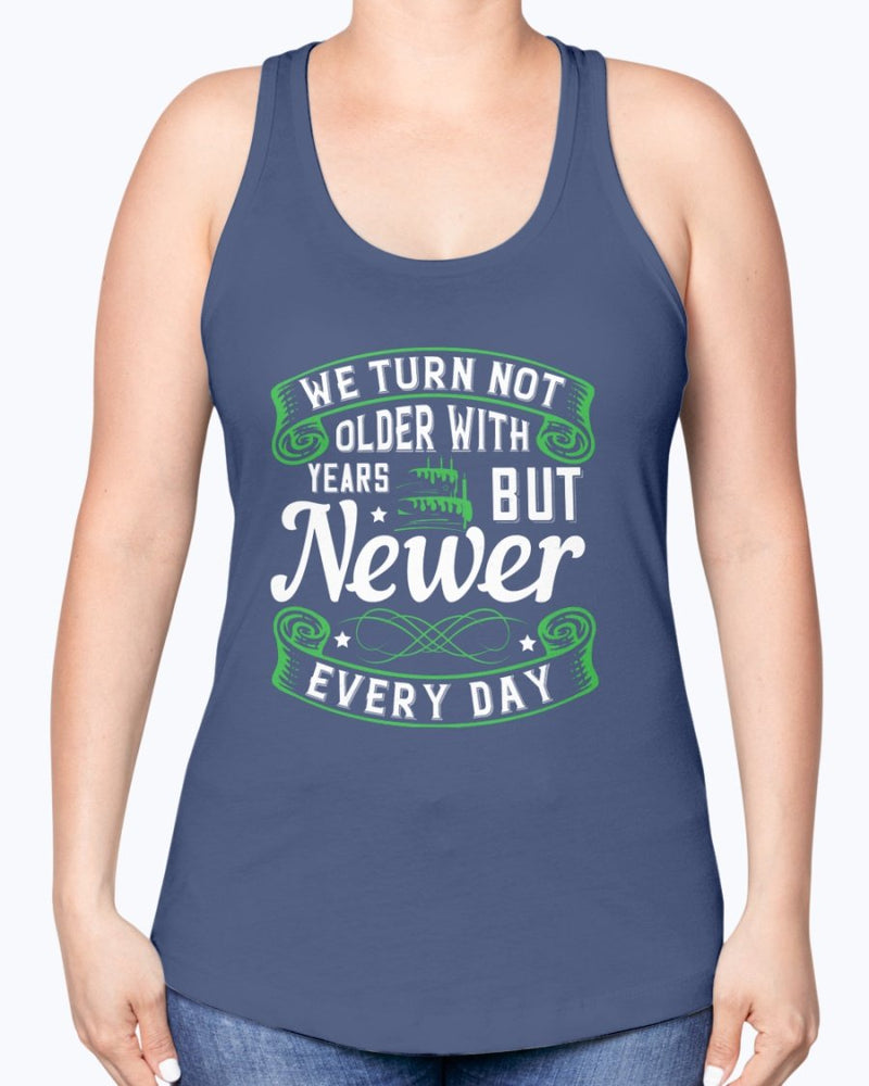 We turn not older with years, but newer every day - Birthday -Racerback Tank