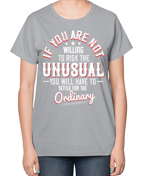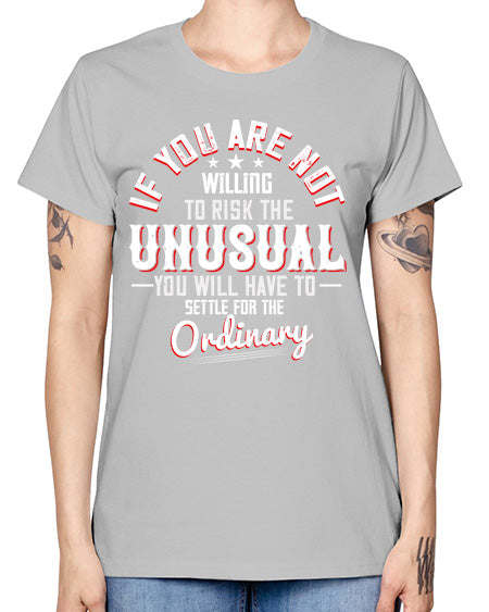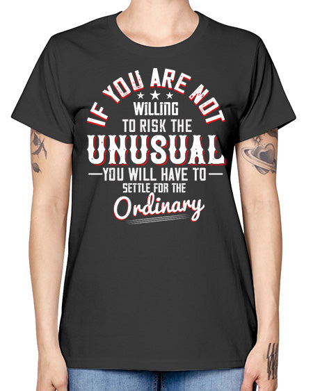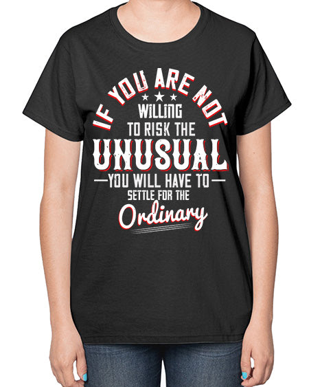 If you are not willing to risk the unusual you will have to settle for the ordinary Style 37# - motivation- Ladies T-Shirt