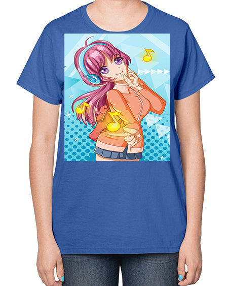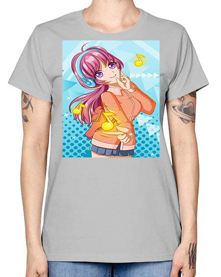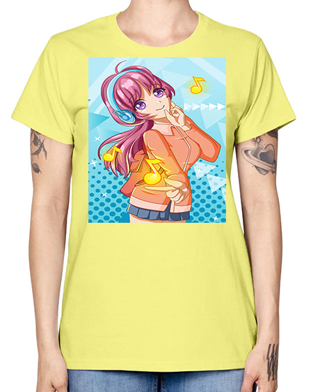 Beautiful and happy girl listening music with music notes 82# - anime- Ladies T-Shirt
