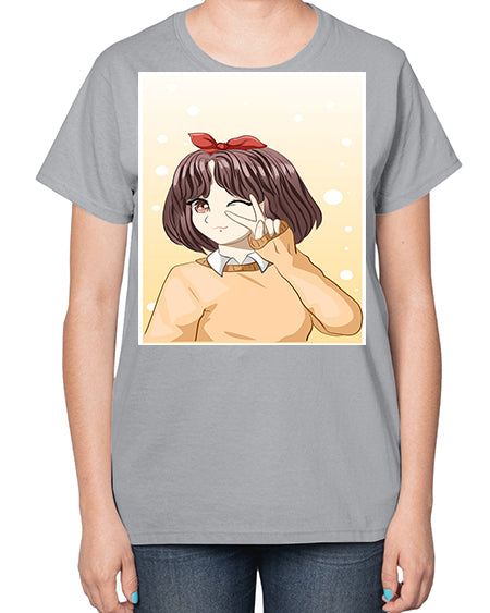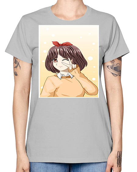 Beautiful and happy girl brown short hair with cheers hand 86# - anime- Ladies T-Shirt