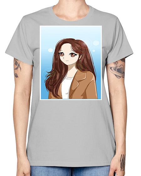 Beautiful and happy girl brown short hair with black jacket 89# - anime- Ladies T-Shirt