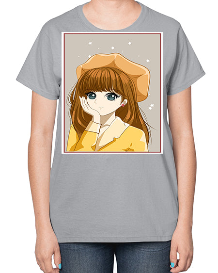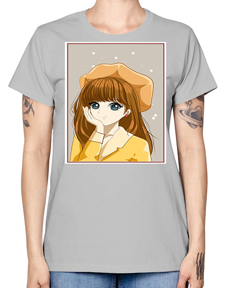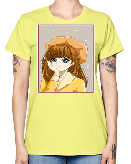 Beautiful and pretty girl brown long hair with yellow hat 128# - anime- Ladies T-Shirt