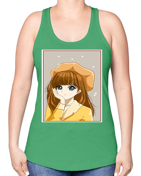 Beautiful and pretty girl brown long hair with yellow hat 128# - anime -Racerback Tank