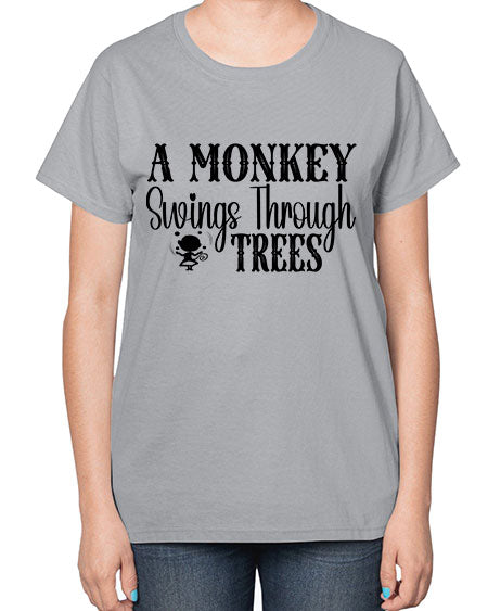 A monkey swings through trees - monkey- Ladies T-Shirt