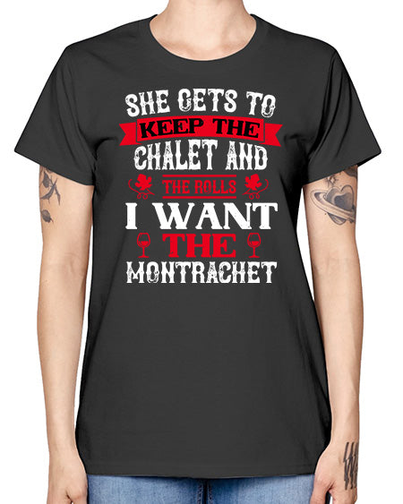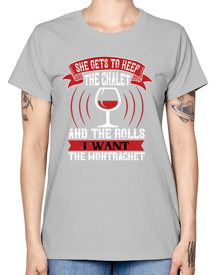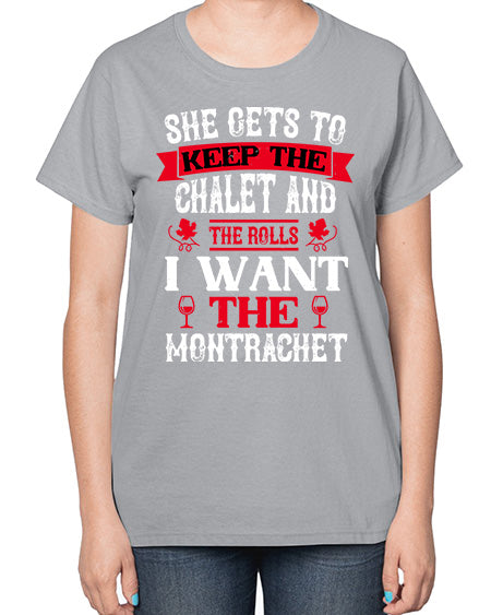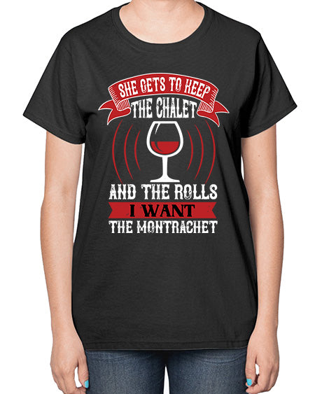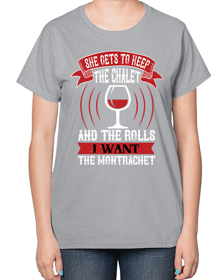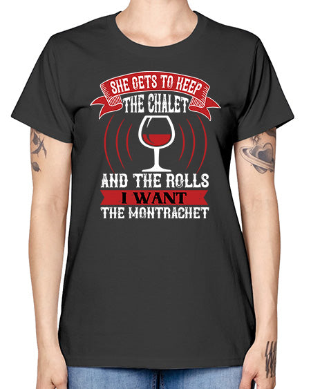she gets to keep the chalet and the rolls 1526# - wine- Ladies T-Shirt