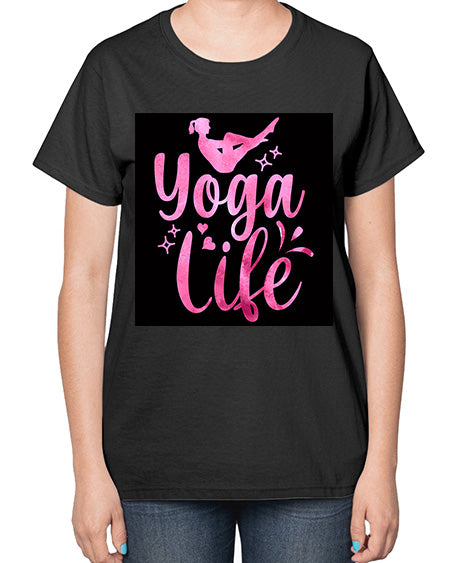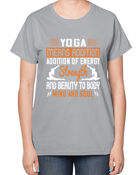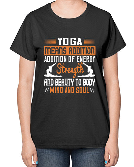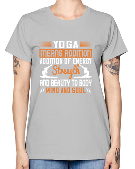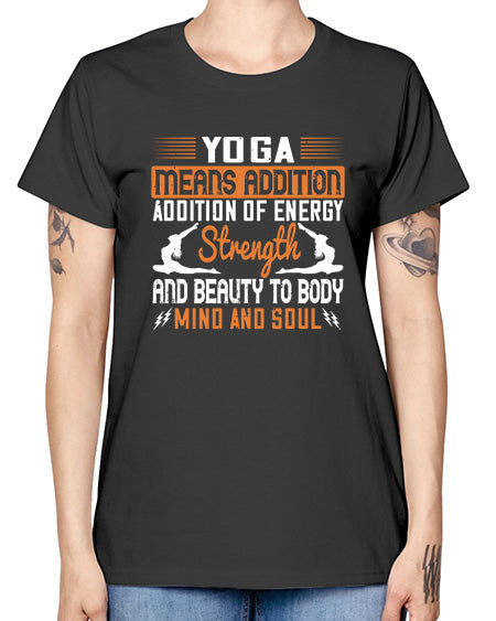 yoga means addition addition of energy strength and beauty to body mind and soul 630# - yoga- Ladies T-Shirt