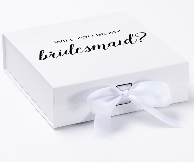 Will you be my Bridesmaid, gift box only, Gold metallic writing on lid of box, white box, with white Bow.