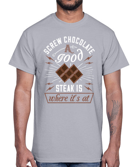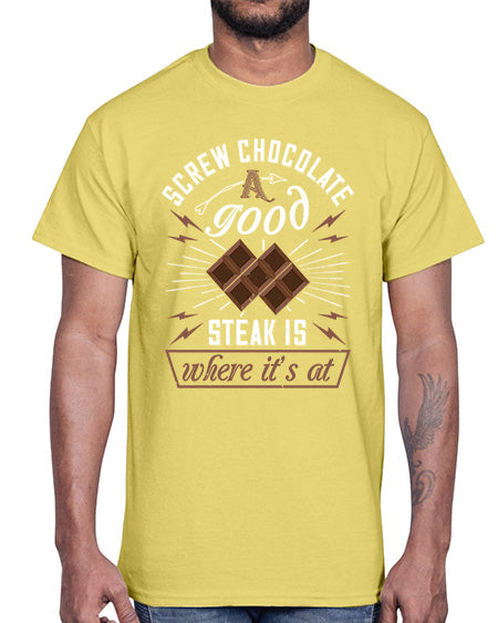 screw chocolate a good steak is where its at 384#- chocolate- Cotton Tee